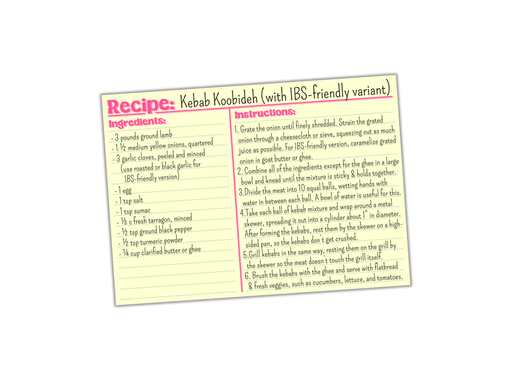 “Oh, good!” said Sura, clapping her hands in happiness. “I have a recipe for kebab koobideh I wanted to try and make Bethany-friendly. It has a lot of grated onion in it, but I think if I caramelize the onion then it might be a little easier on her stomach.”