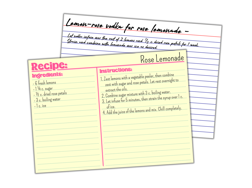 - Let vodka infuse over the zest of 2 lemons and ⅛ c dried rose petals for 1 week.